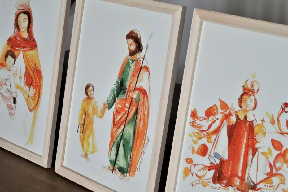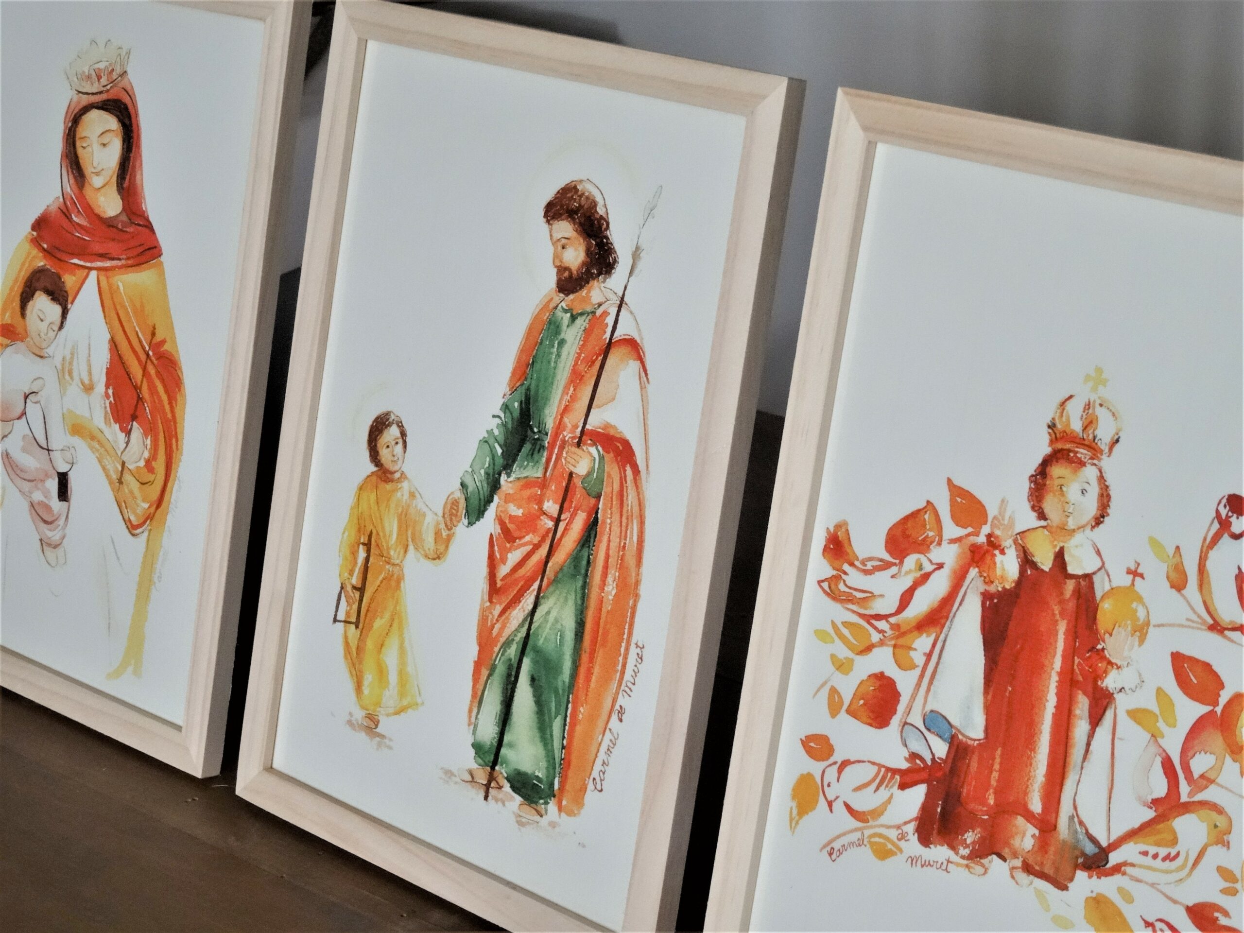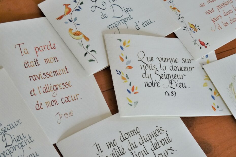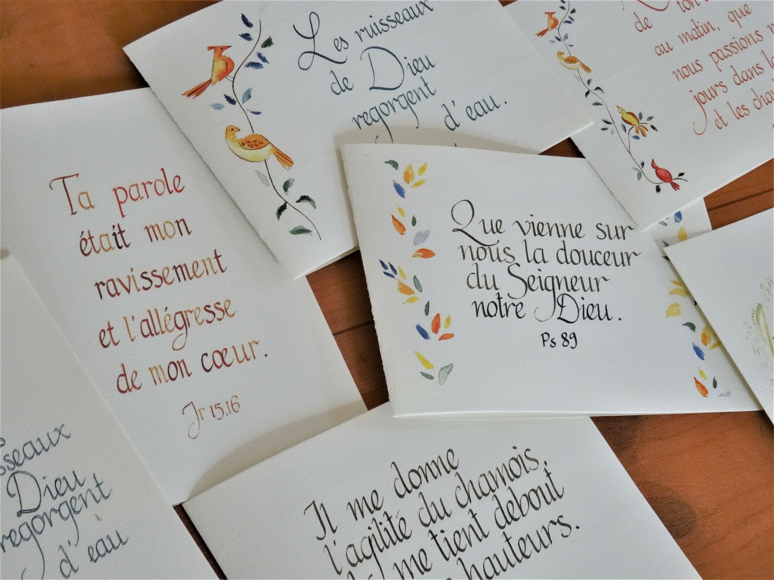 Nous proposons à présent au Carmel et pour les libraires religieuses ou magasins monastiques de très belles cartes d’aquarelles, calligraphies ou peintures à l’huile et acrylique. Tous nos modèles sont disponibles en cartes simples ou doubles imprimées sur un beau papier épais blanc cassé (vergé ou rives, épaisseurs de 210g à 300g).